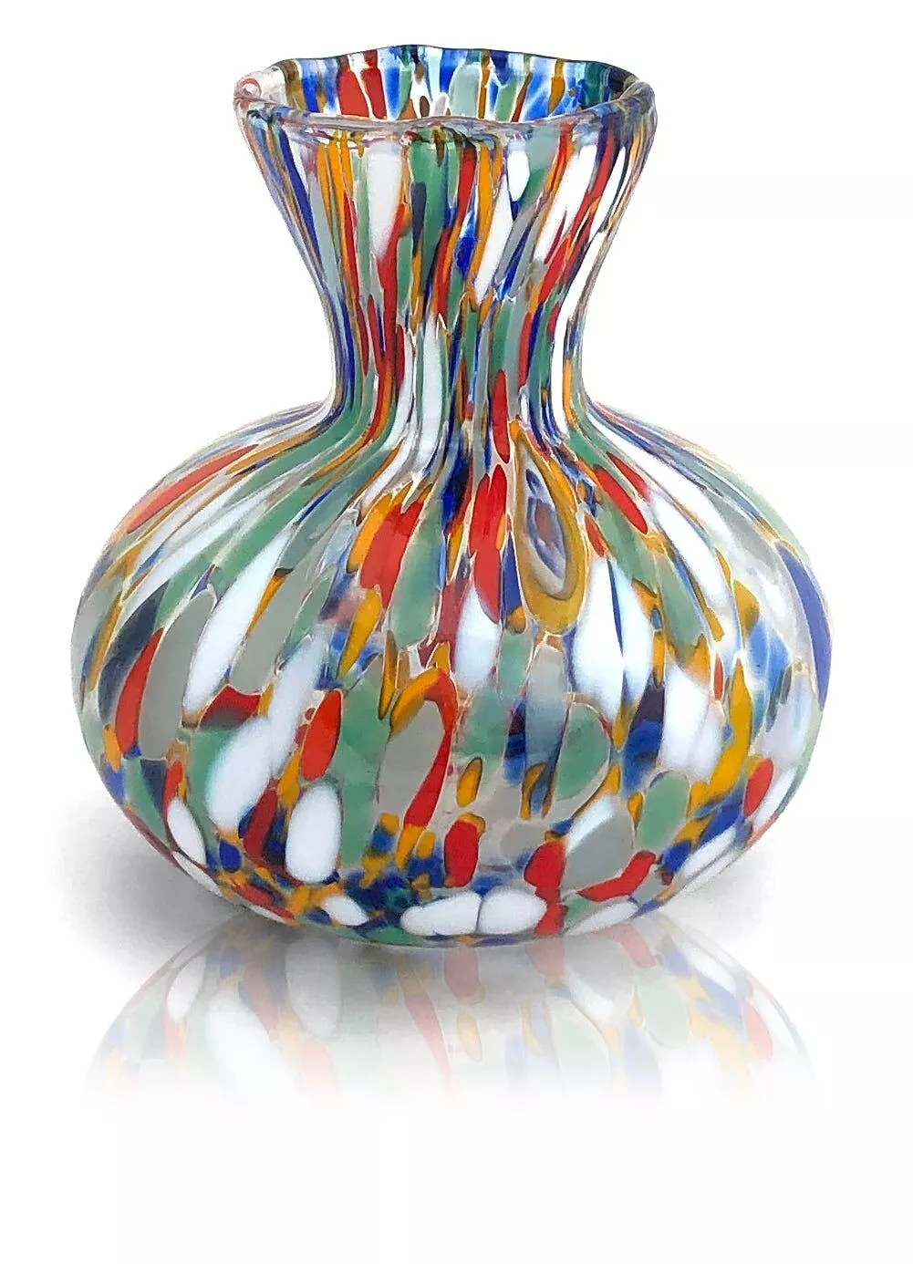 Vaas 9cm, in gekleurd glas. Deze vazen worden volledig met de hand gemaakt door meester-glasmakers in Italië volgens de eeuwenoude traditie van de Murano glasproductie. Kleurrijke handgeblazen vazen in geblazen glas is de perfecte accessoire om kleur en vreugde op tafel te brengen, in transparant kristalglas met levendig gekleurd glasgranulaat. De verfijning en elegantie van deze vazen maken ze tot een uitstekend cadeau-idee.