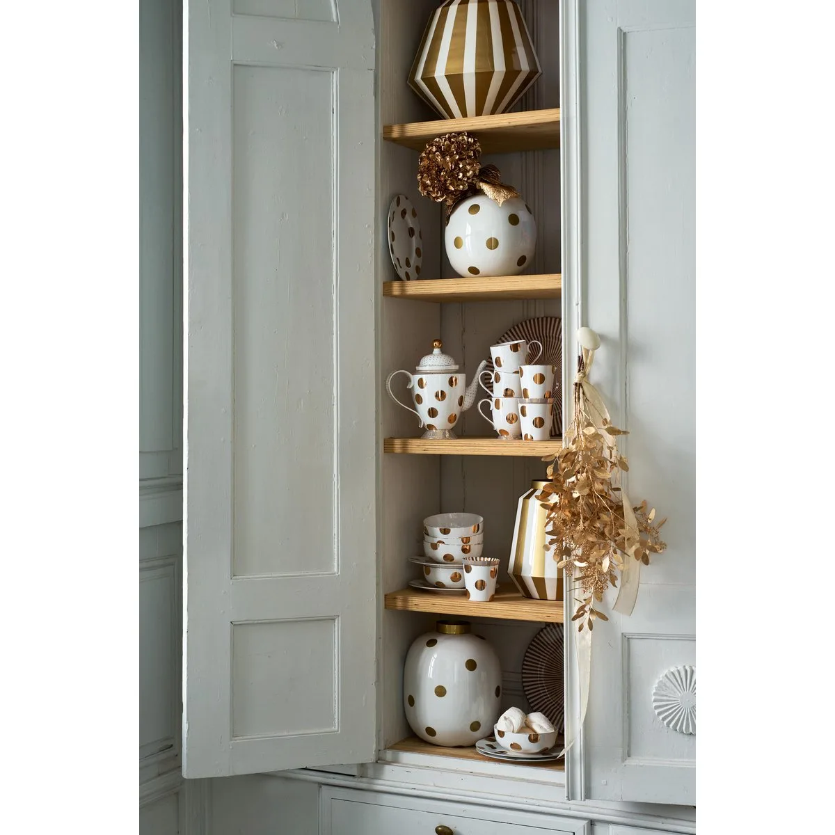 Stijlvolle combinatie van wit met gouden stippen. Glanzende afwerking voor een luxueuze uitstraling. Gemaakt van hoogwaardige a-grade porselein.